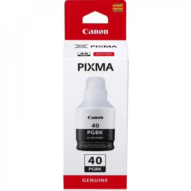 Цвет Canon GI-40 BK – черный, объем емкости составляет 170 мл, чернила могут быть использованы как для печати текста, так и для черно-белых изображений.