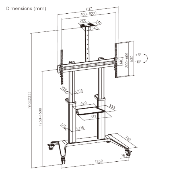 Стойка мобильная Brateck TTL12-610TW оснащена сверхпрочной легкой алюминиевой колонной, надежно закрепленной на эстетически привлекательном основании, что в совокупности обеспечивает наиболее стабильное и надежное решение для больших и тяжелых дисплеев. Конструкция с возможностью свободного наклона позволяет устанавливать телевизор под разными углами. Тележку легко перемещать благодаря встроенной ручке в виде D-образного кольца, а четыре фиксируемых колеса обеспечивают бесшумную и максимальную устойчивость на протяжении всего пути. Предусмотрены регулируемая по высоте полка для камеры и лоток для оборудования, а встроенная система управления кабелями обеспечивает упорядоченное и защищенное расположение проводов.
