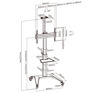 Конструкция с возможностью свободного наклона позволяет устанавливать телевизор под разными углами. Тележку легко перемещать благодаря встроенной ручке в виде D-образного кольца, а четыре фиксируемых колеса обеспечивают бесшумную и максимальную устойчивость на протяжении всего пути. Предусмотрены регулируемая по высоте полка для камеры и лоток для оборудования, а встроенная система управления кабелями обеспечивает упорядоченное и защищенное расположение проводов.